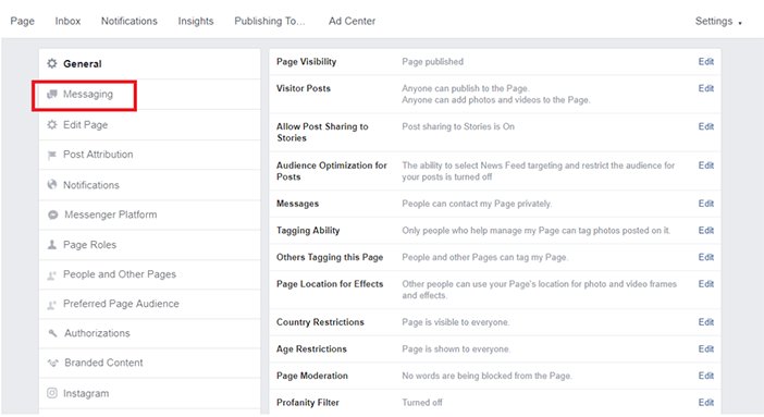 ၁။အရင်ဆုံး Page Setting ထဲကိုသွားပြီး Messaging ဆိုတာကိုရွေးပါ။