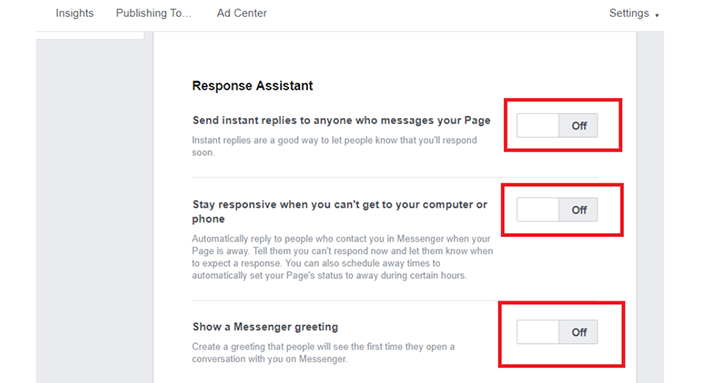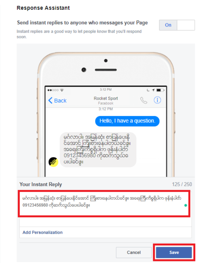 Facebook Page တစ်ခုဖွင့်ပြီးပြီဆိုတာနဲ့ Page ရဲ့ Setting ထဲက Response Assistant ကို ဖွင့်ပေးပါ။