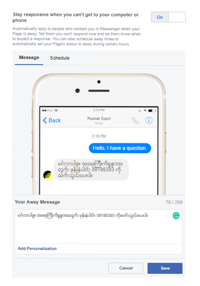 ဒါကတော့ သင့်ရုံးပိတ်ချိန် ဒါမှမဟုတ် Reply မပြန်နိုင်ချိန်တွေမှာ စာပြန်ပို့ပေးတာဖြစ်ပါတယ်။
